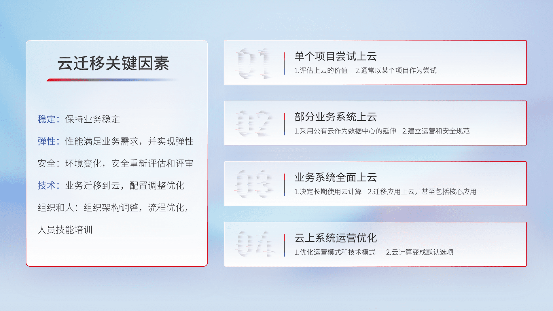 结合实际业务,,从规划设计、、、云平台选型、、、云原生改造、、、数据迁移、、、、集成交付,,,,迁移全过程为客户识别最佳上云路径,,做好风险识别管理,,,,设计网络架构、、、身份权限、、、安全审计合规、、操作审计、、、、日志审计、、监控告警策略、、多站点容灾设计等,,,对云上基础设施进行整体规划,,,提升IT治理水平,,,以满足弹性、、、高可用、、高性能的需求。。。